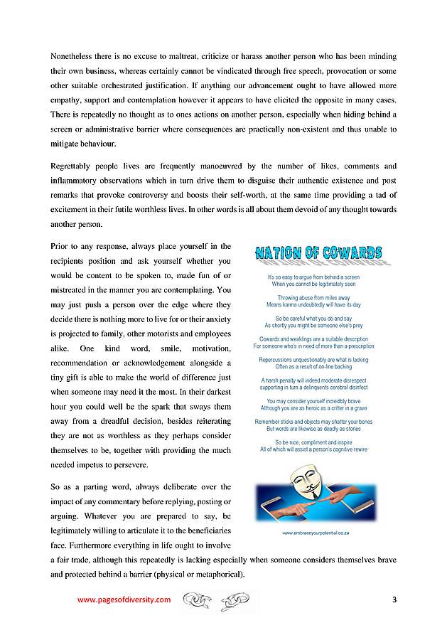 Feel free to send any one of these encouraging pictures to someone you know, however nothing (wording, color etc) may be altered, removed or added in any way whatsoever. In addition credit must be given to www.pagesofdiversity.com